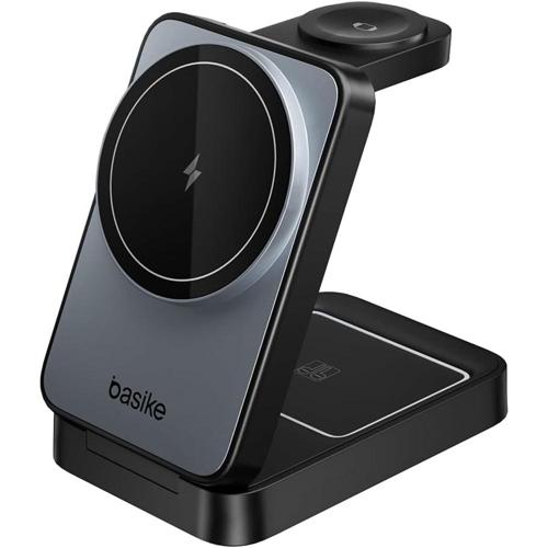 Basike Carregador Sem Fio 3 em 1 Magnético 2025, Estação de Carregamento Portátil com Luz Noturna, Dobrável e Compatível com MagSafe, iPhone 16/15/14/13/12, Apple Watch e AirPod (Preto)